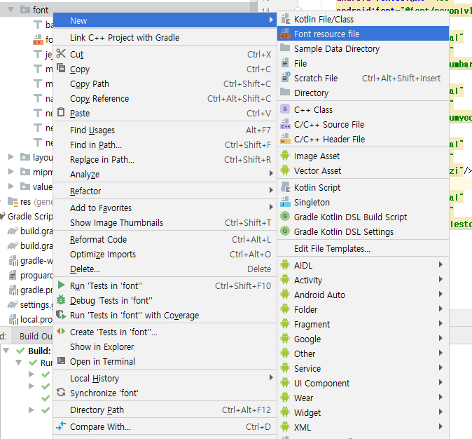 이후 fonts 폴더안에 font.xml 리소스 파일을 생성합니다.