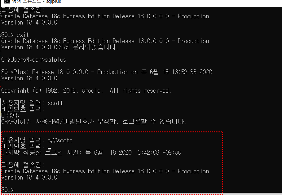 이는 ORACLE 버전이 업데이트 되면서 발생한 문제라고 하는데 맨 앞에 c##을 추가 c##scott으로해서