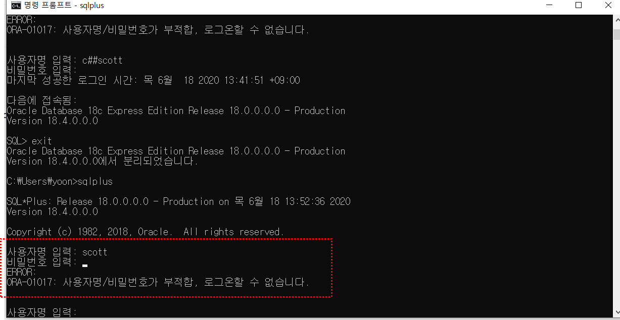 처음 오라클에 연결하려 할 때 분명 scott/tiger로 제대로 설정한 것 같은데도 로그인이 안돼서 한 시간 가량 구글링 하며