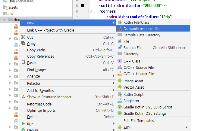 우선 drawable 폴더에 resource 파일을 생성하자