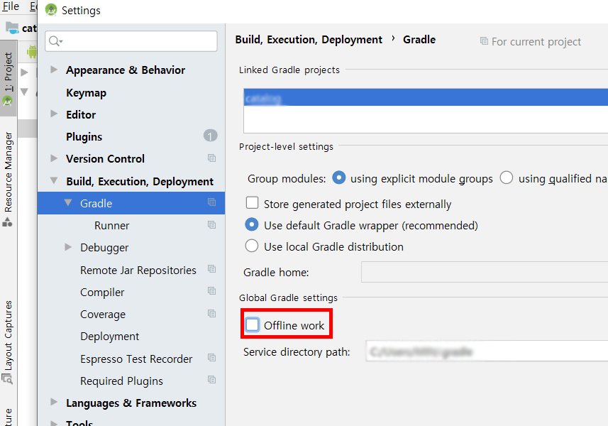 Build, Execution, Deployment에서 Gradle 항목으로 들어가 보면 Offline work가 체크되어있는 모습을 볼 수 있다.