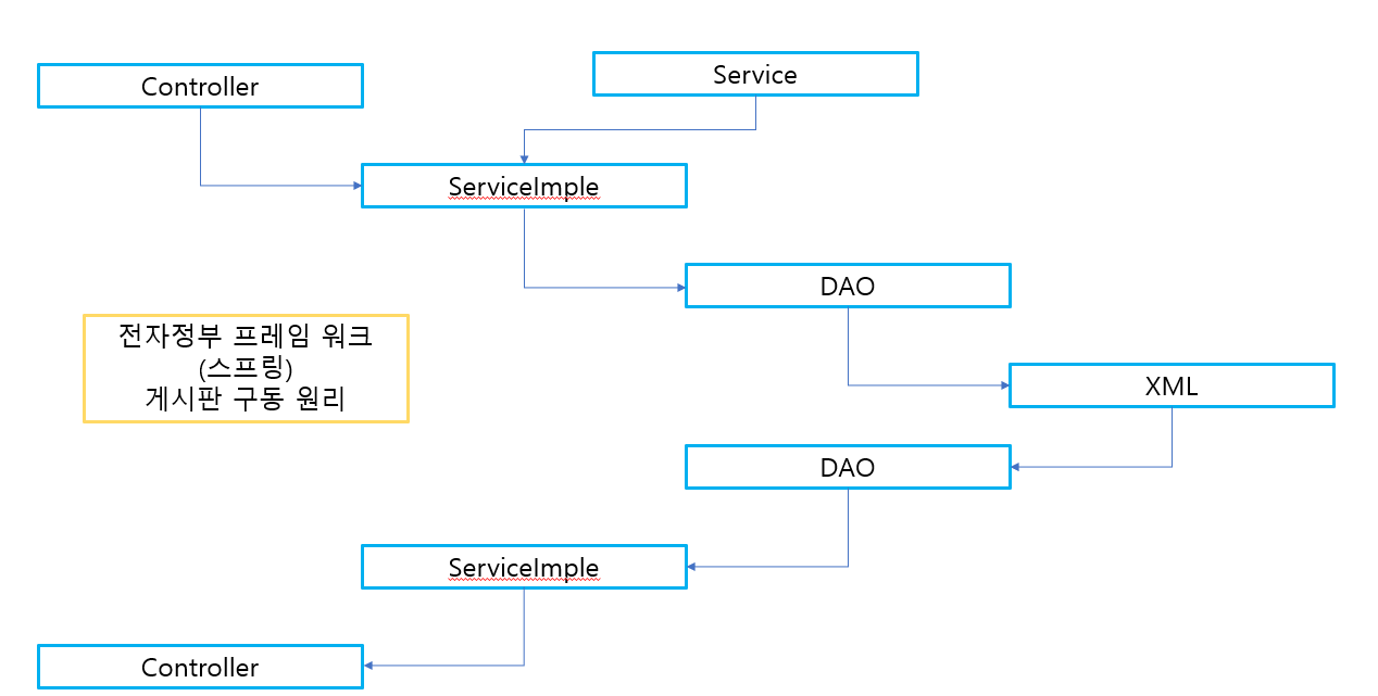 해서 요청을 하면 그 요청이 ServiceImple로 넘어가고 (이때 serviceImple은 반드시 Service에 선언 되어 있어야한다 - 인터페이스 개념) 그 값들이 DAO 로 들어가고 -> 쿼리문이 있는 XML파일로 넘어가 쿼리문이 실행되고 -> 실제 해당하는 값들을 가지고 온 후 왔었던 과정을 그대로 반환하여 Controller로 돌아간다